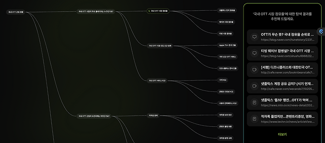 소나 스테이션에서 사용할 수 있는 '플로우'는 검색 결과를 시각화(마인드맵 형태)해 확인할 수 있어요. '국내 OTT 산업 현황'을 검색하면, 주요 플레이어, 도전 과제, 성장 요인 등을 바탕으로 세부 내용과 키워드를 확인할 수 있죠. 각 키워드를 선택하면 검색 결과에 해당하는 콘텐츠(소스)를 함께 제공해 줘요. 리서치 범위를 잡을 때 특히 유용하게 활용할 수 있어요.
