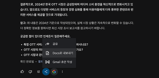 구글 제미나이는 일반 모델에도 답변을 구글 문서로 보낼 수 있는 기능을 포함하고 있어요. 제미나이 역시 구글 검색 결과를 바탕으로 답변을 생성하는데요. 리서치에 필요한 내용을 확인한 뒤 문서로 내보내 간략한 편집 및 확인 과정만 거치면 리서치와 문서 작성이라는 작업을 한 번에 진행할 수 있어요.
