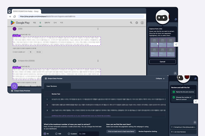 오늘 소개할 ‘Browse ai’라는 서비스를 활용하면 웹사이트 상의 특정 데이터를 빠르게 추출하고, csv 파일로 다운로드해 활용할 수 있는데요. 애플 앱스토어는 정책 때문인지 PC에서 모바일 앱 리뷰를 확인할 수가 없어 아쉽지만 구글 플레이스토어 리뷰를 추출해 보기로 했습니다. (서비스가 특정될 수 있는 부분은 블러 처리했으니 양해 부탁드려요😉)