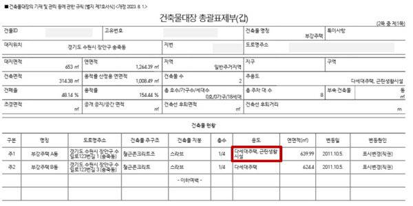 어떻게 이런 건물 형태가 가능한걸까. 집주인이 주택을 매수한 뒤 용도를 기존 다세대주택에서 편의점 등 상업시설로 운영할 수 있는 근린생활시설로 변경했기 때문인 것으로 분석된다. 실제로 건축물대장을 확인한 결과 B동 용도는 다세대주택으로만 적혀있는 반면, A동은 다세대주택·근린생활시설 두 가지로 기재돼있다.