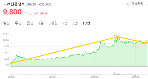 고려신용정보는 과거 주가 추이를 살폈던 곳인데요. 주가가 2015년경부터 꽤 오랫동안 가파르게 올랐기 때문입니다. 그런데 최근 들어 그 추세가 꺾인 상태죠.