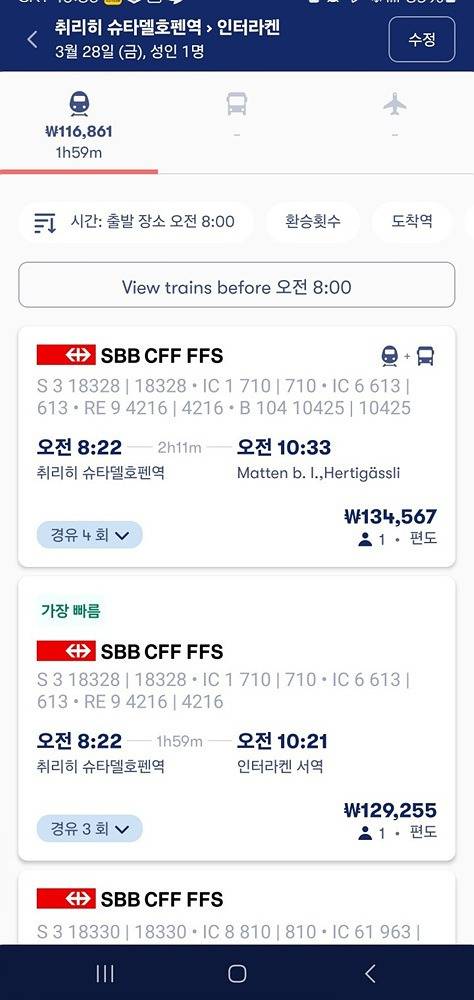 첫 번째는 항공권이나 교통편 예약 앱이다. 항공권은 스카이스캐너를 주로 많이 이용했다. 한국에서 나가고 들어오는 건 아시아나항공을 이용했는데 여행사 다니는 친구 덕에 저렴하게 구입할 수 있었다. 스카이스캐너는 이탈리아 로마에서 스위스 취리히 갈 때 스위스항공을 예약하는데 활용했다. 유럽 내에서 기차(SBB)나 떼제베 예매는 오미오(Omio)를 이용했다. 오미오는 유럽 전역의 기차, 버스, 항공편을 한 번에 검색하고 예약할 수 있다.