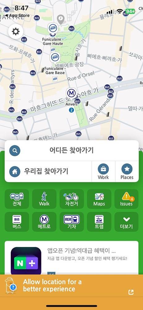 구글 맵과 함께 꼭 써야 하는 앱은 시티맵퍼(Citymapper)라는 앱이다. 구글 맵이 도보 중심이라면 시티맵퍼는 대중교통 중심 앱이다. 지하철 노선이나 버스 정류장 등을 자세하게 안내해줘 초행길도 부담없게 해준다. 특히 유럽에 특화되어 있다고 한다. 목적지를 입력하면 기차나 전철, 버스, 도보를 활용해 경로, 소요 시간 등을 알려준다. 이 앱이 없었으면 프랑스 파리에서 엄청 헤맸을지도 모른다.