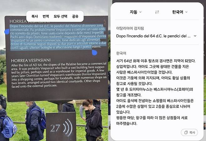 네 번째는 번역 관련 앱이다. 요즘 번역 앱이 많이 나와 있긴 한데 대화하는 건 콩글리쉬를 활용해 대충 하고 주요 관광지에서 설명 안내판을 모두 보고 있을 순 없다. 특히 이탈리아어나 프랑스어는 완전 까막눈이라 번역 앱이 필요하다. 우린 갤럭시 스마트폰에 내장된 기본 번역 기능을 활용했다. 일단 사진을 촬영한 다음 손가락으로 꾹 누르면 영역을 지정할 수 있고 이를 번역해주는 기능이 있다. 완전히 자연스럽지는 않지만 의미를 이해하는 데는 충분했다.
