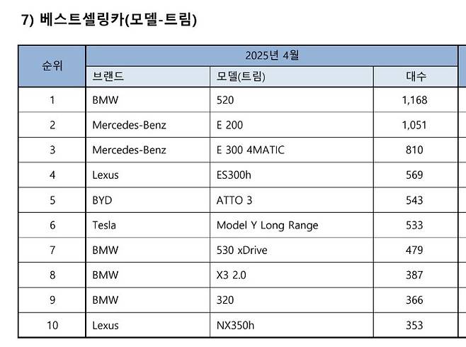 KAIDA는 매월 초 수입차 신규 등록 통계 자료를 국내 미디어에 배포할 때 베스트셀링카 분류를 모델-트림과 모델-그룹으로 나눠서 발표한다. 모델-트림 기준 상위 10개 차종을 보면 아토3는 543대가 등록돼 5위를 기록했고 모델Y 롱레인지는 533대가 등록돼 7위다. 반면 모델-그룹 기준 상위 10개 차종에서는 모델Y가 3위(804대) 모델3가 4위(638대)를 기록했다. 아토3는 이 기준에서 7위다.