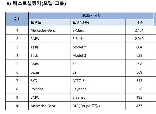 국토교통부 자동차등록 데이터를 기반으로 국산차와 수입차 신규등록 데이터를 분석하는 카이즈유데이터연구소는 신차 등록 승용 수입차 차종별 대수를 연료별로 구분하지 않고 발표한다. 카이즈유가 배포한 4월 수입차 차종별 등록대수를 보면 모델Y가 804대 등록돼 벤츠 E클래스 BMW 5시리즈에 이어 3위를 기록했고 아토3는 7위에 오른 것으로 확인된다.