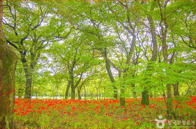걷는 이마다 발길을 멈추게 하고, 숲 속 고요한 분위기와 붉은 꽃빛이 어우러져 한 폭의 수묵화 속 붉은 채색처럼 감동을 줍니다.