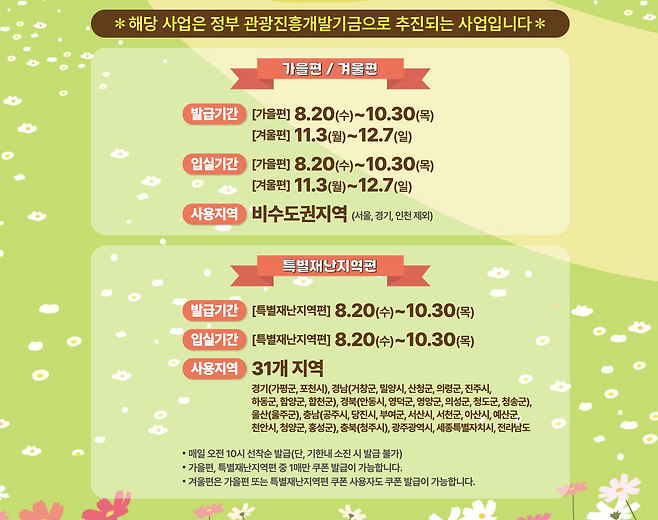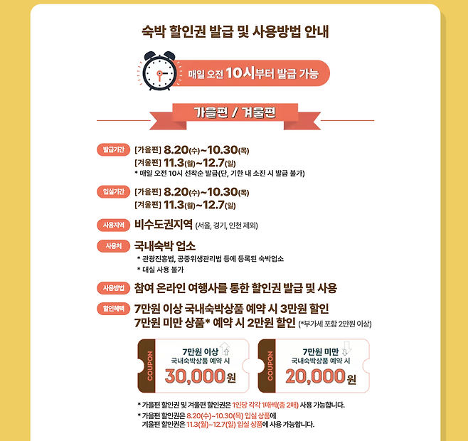 숙박세일페스타는 국내 관광 수요를 높이고, 동시에 특별재난지역의 경제 회복을 돕기 위해 마련되었습니다. 발급 대상은 수도권 외 전국 숙박시설이며, 그중에서도 특별재난지역은 일반 지역보다 더 높은 금액의 할인을 받을 수 있습니다. 가을편과 재난지역편은 8월 20일부터, 겨울편은 11월 3일부터 발급이 시작되며, 쿠폰은 매일 오전 10시에 선착순으로 발급됩니다.