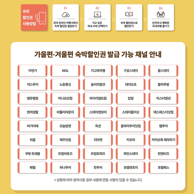 쿠폰은 여러 온라인 여행사(OTA)를 통해 발급받을 수 있으며, 대표적으로 여기어때, 마이리얼트립, 하나투어, 11번가, 트립비토즈 등이 참여하고 있습니다. 여행사마다 발급 가능한 쿠폰 종류가 다르기 때문에, 사용 전 발급 가능 여부를 확인하는 것이 좋습니다. 오전 10시 이전에 접속해 대기하는 방식으로 준비하면 쿠폰 발급 성공 확률을 높일 수 있습니다.
