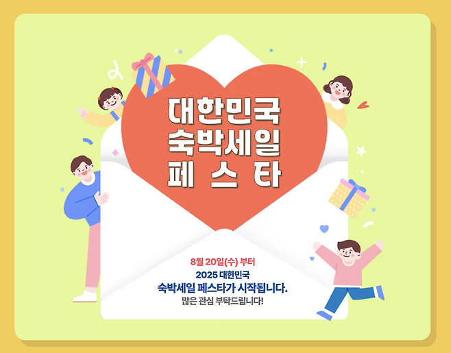 다가오는 가을과 겨울, 국내 여행을 계획하고 있다면 ‘2025 대한민국 숙박세일페스타’를 주목할 필요가 있습니다. 이 행사는 문화체육관광부와 한국관광공사가 함께 주관하는 전국 단위의 여행 지원 프로모션으로, 국내 비수도권 숙박에 대해 최대 5만 원까지 할인 혜택을 제공합니다. 특히 선착순 쿠폰 발급 방식으로 진행되며, 총 80만 장의 쿠폰이 한정 수량으로 제공됩니다.