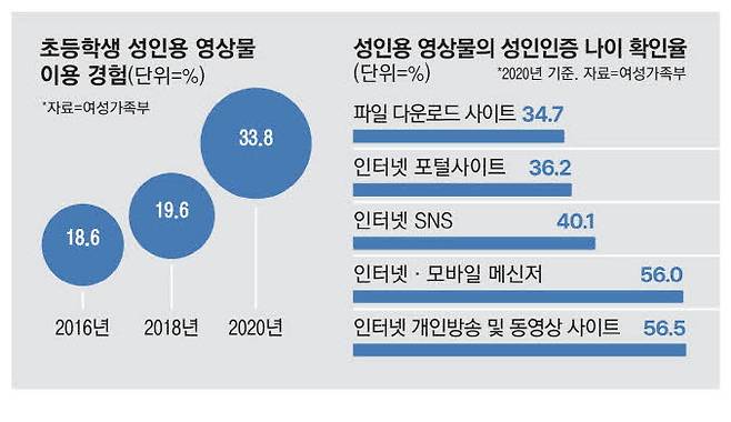 2일 여성가족부에 따르면 성인용 영상물 시청 경험이 있는 청소년의 연령대는 점차 낮아지고 있다. 성인물 영상을 시청한 적이 있는 초등학생 비율은 2016년 18.6%에서 2018년 19.6%, 2020년 33.8%로 급격히 늘어났다. 지난해에는 2020년보다 그 비율이 더 증가했을 것이라는 게 전문가들 의견이다.