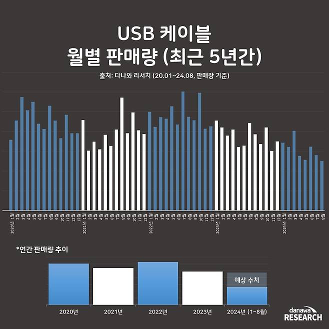 2023년은 전년보다 다소 낮은 판매량을 기록했다. USB 케이블의 내구성이 1년 이상이기 때문에 교체 주기가 돌아오지 않은 것으로 파악된다. 2024년의 경우, 8월까지의 데이터만 집계되었으나, 연말까지는 2023년 정도의 판매량을 기록할 것으로 예상된다. 월별 판매량을 분석해 본 결과, 계절적 요인보다는 기술 발전이나 신제품 출시와 같은 외부 요인이 USB 케이블 판매량 변동에 더 큰 영향을 미쳤음을 추측해 볼 수 있다.