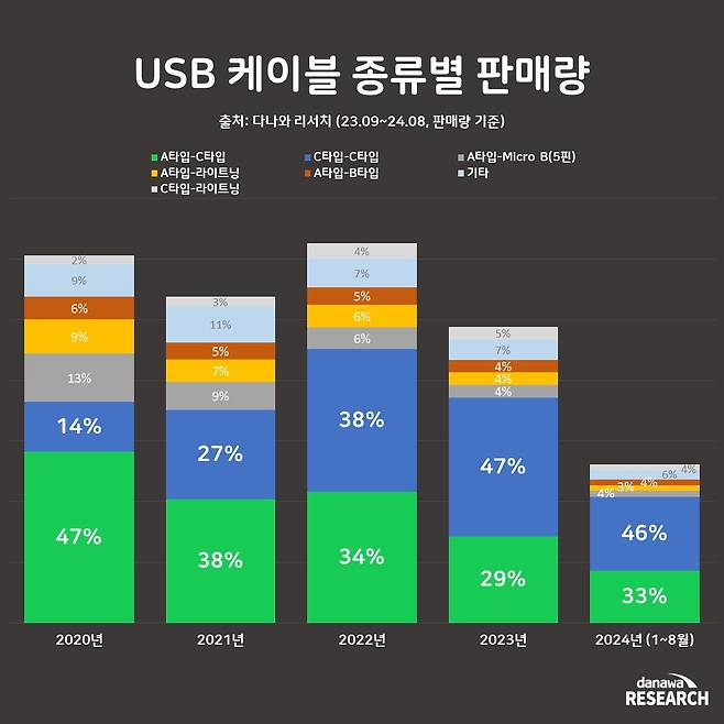 2020년 14%에 불과했던 C타입-C타입 케이블은 2021년부터 판매량이 급격히 증가해 2022년에 38%로 가장 큰 비중을 차지했다. 이는 USB-C 규격의 보편화로 인한 수요의 증가로 예상된다. 2023년은 47%로 가장 높은 비중을 기록했으며, 2024년 8월까지 집계된 데이터에서도 46%의 높은 비중을 차지하고 있다.