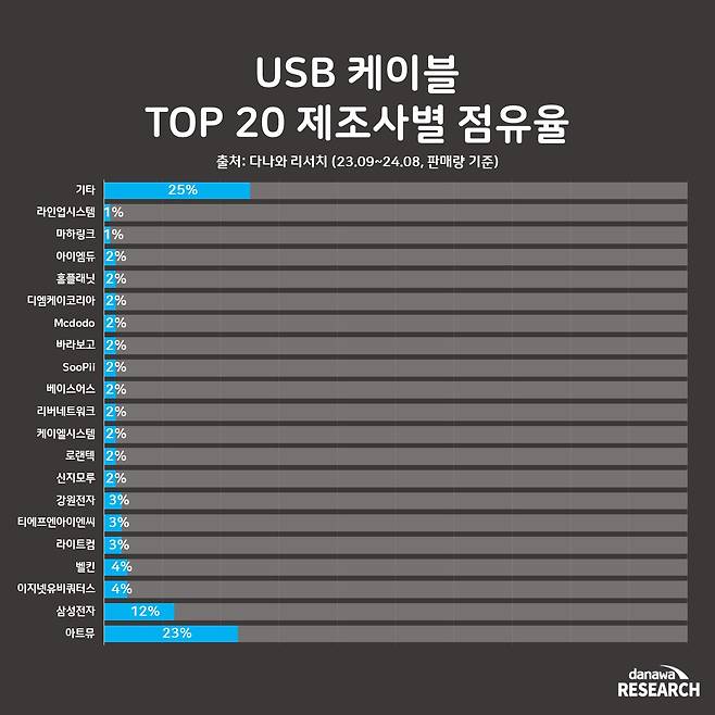 USB 케이블 시장의 상위 20개 제조사 점유율을 살펴보자. 아트뮤가 23%의 점유율로 시장에서 가장 강력한 입지를 차지하고 있다. 아트뮤는 다양한 규격과 용도에 맞는 케이블을 출시해 소비자들의 다양한 요구를 충족시켜 높은 점유율을 유지하는것으로 분석된다. 그 뒤를 이어 삼성전자가 12%의 점유율로 2위를 차지했다. 삼성전자는 글로벌 스마트폰 제조사 답게 USB 케이블이 정품이라는 인식으로 신뢰도가 높아 꾸준히 판매량을 유지하고 있다.