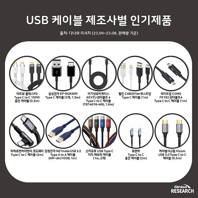 2020년 전체 판매량의 47%, 2020년 38%의 점유율을 기록해 가장 큰 비중을 차지했던 A타입-C타입 케이블은 2022년 34%, 2023년 29%로 점점 감소해 전체 판매량이 2위로 밀렸다. 하지만 여전히 주요 판매 제품군에 속한다.
