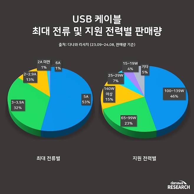 지원 전력은 100~139W가 46%의 점유율로 가장 많이 판매되었다. 최대 전류와 마찬가지로 이 범위는 고성능 노트북, 태블릿, 스마트폰 등에서 사용되는 고출력 충전 케이블류다. 그 뒤를 이어 65~99W가 23%의 점유율로 2위를, 140W 이상(15%), 25~29W(7%), 15~19W(4%) 순으로 나타났다.