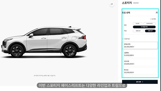 기아 스포티지의 페이스리프트 모델이 출시되면서 다양한 변화가 있었다. 우선 엔진 라인업이 풍부해졌다. 1.6 가솔린 터보, 2.0 LPG, 1.6 터보 하이브리드 등 고객 선택의 폭이 넓어졌다. 또한 2WD, 4WD 등 구동 방식도 선택할 수 있게 되었다.