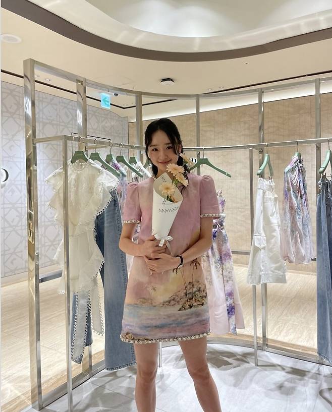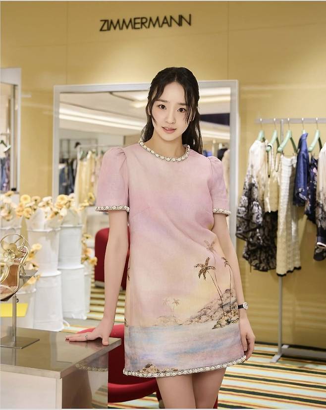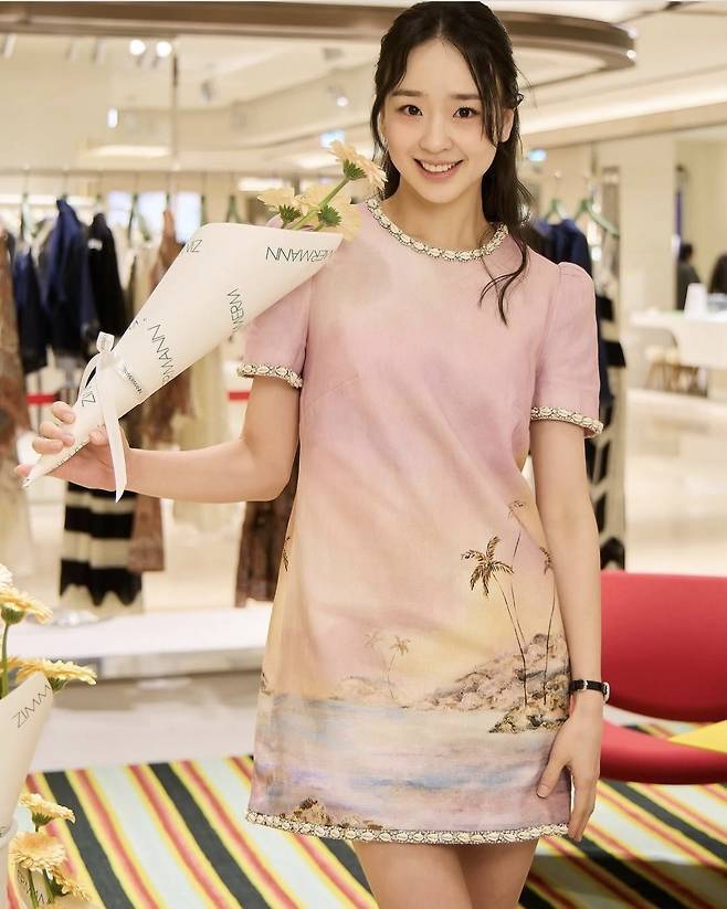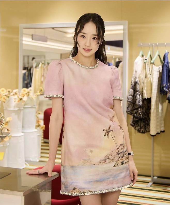 손연재는 노을 진 해변 풍경이 그려진 핑크 미니드레스를 착용하고 등장해, 마치 그림 속에서 막 걸어 나온 듯한 분위기를 완성했습니다.