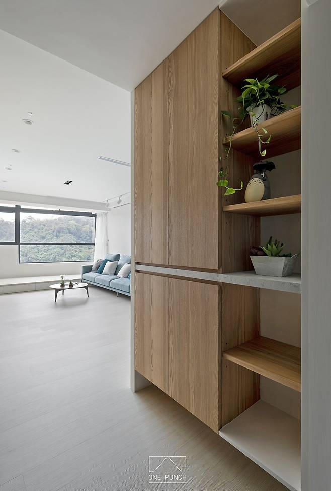 오토바이를 타는 다섯 식구를 위해 마련된 열린 수납장은 실용성과 미감을 동시에 만족시킨다. 돌과 나무 무늬가 어우러진 캐비닛은 짠 면직물처럼 공간에 질감을 채워주며, 하루를 단정하게 시작하고 마무리할 수 있는 기능적인 장소로 재탄생한다.