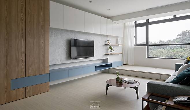 창가는 거실과 이어지는 확장된 공간이 되었고, 사용하지 않던 자투리 공간까지 '살아 있는 생활 공간'으로 녹여냈다. 멜라민 보드를 활용해 관리까지 쉬워진 덕에, 변덕스러운 날씨에도 걱정이 없다. 공작색 소파는 TV 벽과 조화를 이루면서, 집 안 분위기를 한층 우아하게 이끈다.