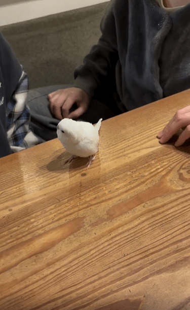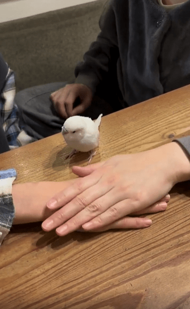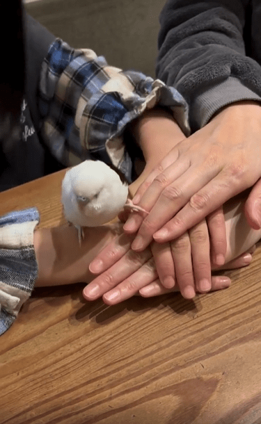 그러다 손이 모두 포개진 마지막 순간. 마치 기다렸다는 듯, 새가 움직입니다. 작고 가느다란 다리로 테이블을 성큼 건너더니, 망설임도 없이 사람 손 위를 차례로 밟고 올라섭니다. 그 발걸음엔 불안이나 당황스러움은 전혀 없습니다. 마치 자신이 그 순서를 정확히 알고 있는 것처럼, 마지막 손등 위에 살포시 발을 얹습니다.