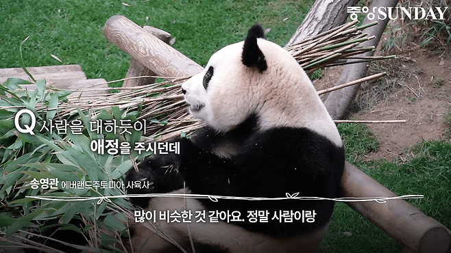 송바오는 "많이 비슷한 거 같아요. 정말 사람이랑. 그렇게 차근차근 조금씩 조금씩 가족이 돼버린 느낌? 가끔 정말 사람 같기도 하고" 라고 대답했습니다.