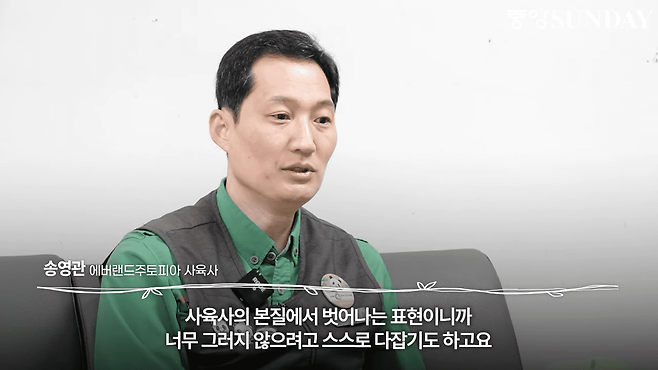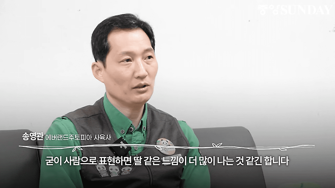 그러면서 그는 "사육사의 본질에서 벗어나는 표현이니까 너무 그러지 않으려고 스스로 다 잡기도 하고요" 라고 덧붙였습니다.