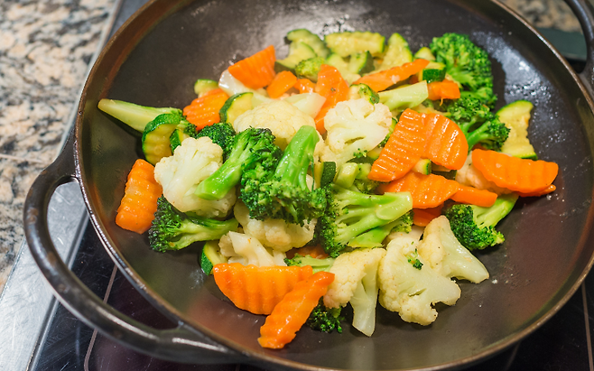 채소는 팬에 물을 살짝 두른 뒤 살짝 익히고, 조미료와 향신채로 맛을 내면 기름 없이도 맛있는 반찬이 완성됩니다.