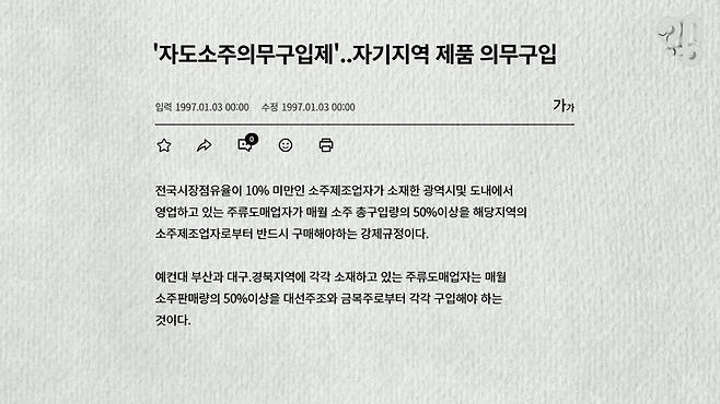 실제로 1970~90년대에는 ‘자도주 보호 제도’가 있어, 지역별로 한 업체만 소주를 만들고 생산량의 절반 이상을 그 지역에서 소비하도록 했다.