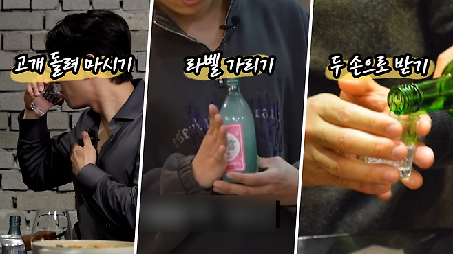 취재하다 알게 된 건데, 라벨 가리기 외에도 술자리 예절인 ‘주도’에는 정말 다양한 규칙이 있다. 술을 받은 뒤엔 입을 대고 잔을 내려놔야 하고, 잔을 부딪힐 땐 어른의 잔보다 낮게, 술을 마실 땐 고개를 돌려야 한다는 식이다.