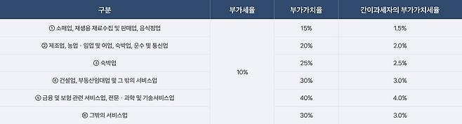간이과세자의 부가가치세율은 일반과세자의 부가가치세율 10%에 업종별 부가가치율을 곱한 값으로 계산합니다. 업종별 부가가치율은 업종에 따라 15%~40%이므로, 간이과세자의 부가가치세율을 1.5~4%로 표기했습니다. 그중에서도 온라인쇼핑몰은 ‘소매업, 재생용 재료수집 및 판매업, 음식점업'에 적용되는 부가가치율 15%가 적용됩니다. 여기에 부가가치세율 10%를 곱해 나온 값이 1.5%입니다. (아래 표 참조)