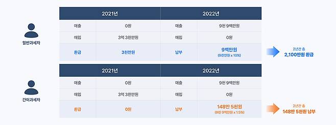 만약 김토스 씨가 2021년에 간이과세자로 사업을 시작했다면, 초기 투자비용인 3억 3천만 원에 대해 부가가치세를 한 푼도 환급받지 못했을 겁니다. 간이과세자는 매출세액보다 매입세액이 큰 경우에도 부가가치세 환급을 받지 못 하니까요. 그렇다면 김토스 씨가 벌어들인 9천9백만 원의 매출에 대한 부가가치세는 얼마를 낼까요? 2022년의 매출 9천9백만 원에 대해 1.5%에 해당하는 148만5천 원을 부가세로 납부하겠죠.