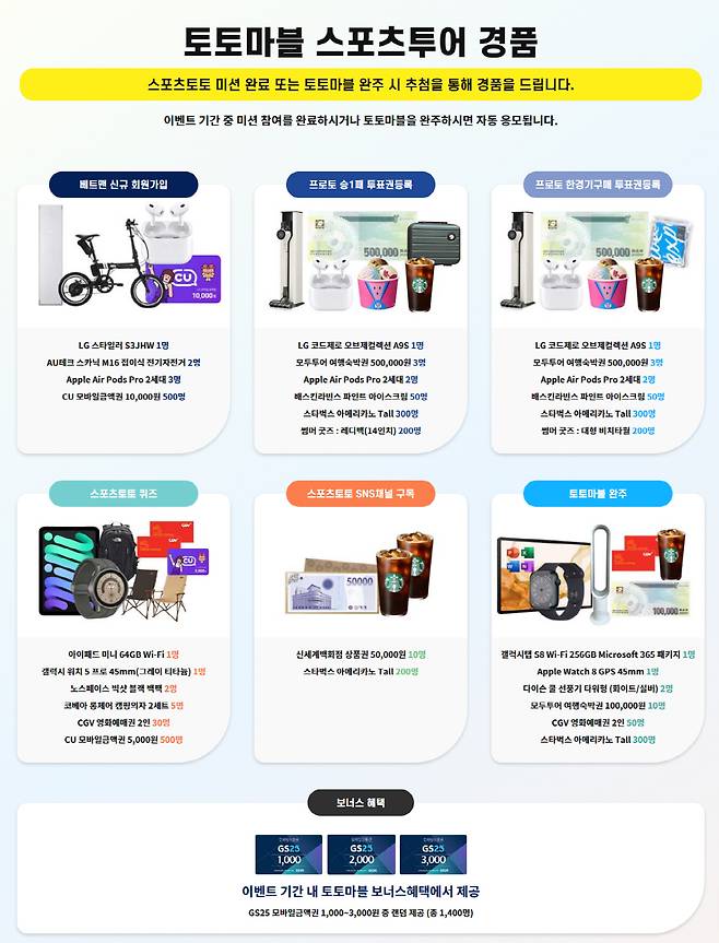 단, '토토마블 스포츠투어'에서는 각 미션별로 받을 수 있는 스페셜 경품이 달라지며, 참여 완료 후 추첨을 통해 LG 스타일러, LG 코드제로 오브제 컬렉션, 접이식 자전거, 모두투어 여행숙박권(50만원), 애플 아이패드 미니, 에어팟 프로 2세대, 갤럭시 워치 5 프로 등 푸짐한 경품을 증정한다. 이와 별개로 이벤트 기간 내 토토마블 보너스 혜택에서는 1000원~3000원권의 GS25 모바일상품권(총 1400명)을 증정한다.