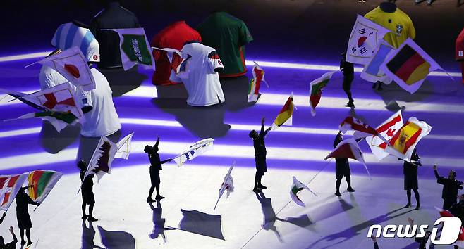 (도하(카타르)=뉴스1) 이동해 기자 = 20일 오후(현지시간) 카타르 알코르 알베이트 스타디움에서 열린 2022 카타르 월드컵 개막식에서 화려한 공연이 펼쳐지고 있다.