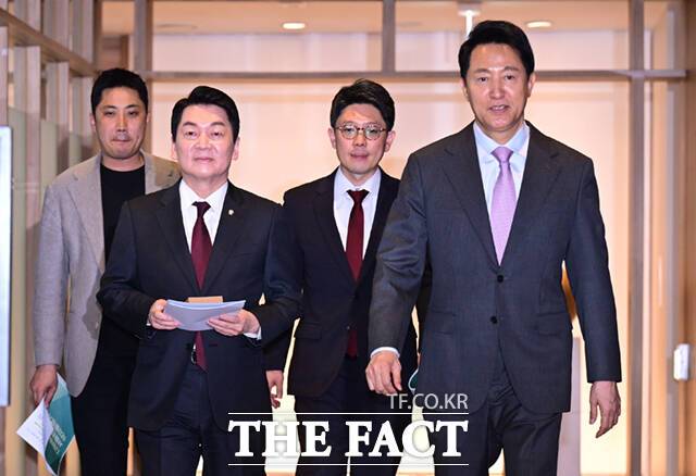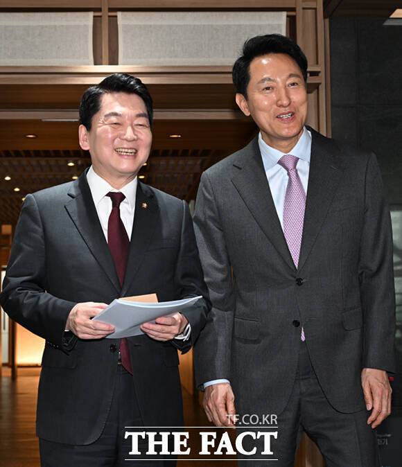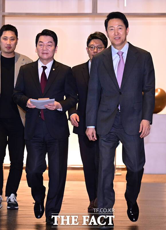 안 의원은 오 시장과 예방 이후 기자들과 만나 "(오 시장이)저와 정치적 스탠스가 가장 비슷하다 그 말씀을 하셨다"며 "아마도 중도 확장성에 대해서 말씀을 하시는 것 같다. 이번 선거가 정말 중요하다. 양쪽이 똘똘 뭉친 상태에서는 결국은 중도에서 한 표라도 더 가져오는 사람이 이길 수밖에 없는데, 결국은 중도 확장성이 이 선거의 승패를 좌우한다 그런 뜻에서 뜻을 같이 했다"고 말했다.