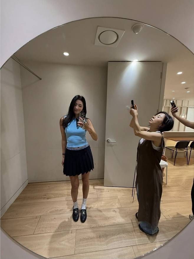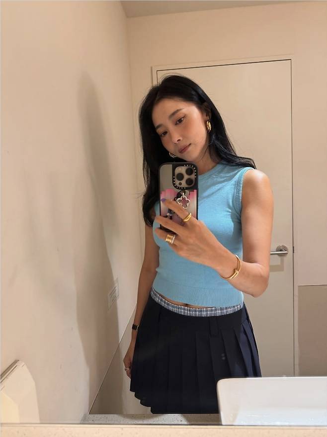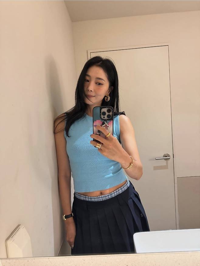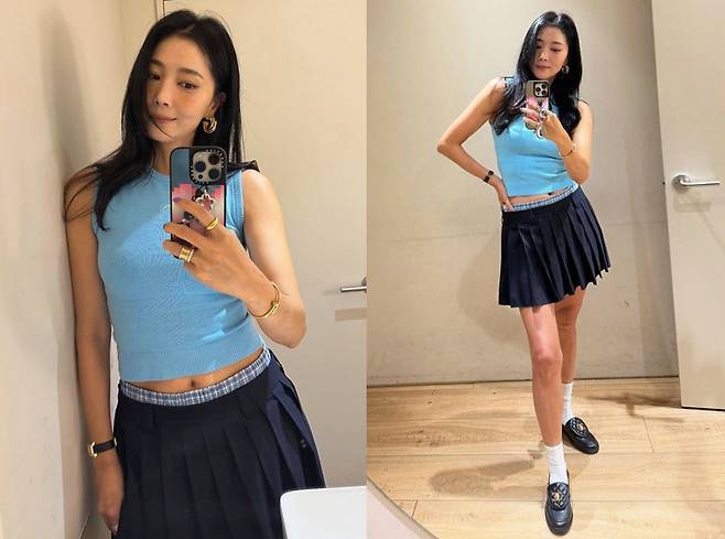 시원한 민트빛 민소매 니트 톱에 체크 웨이스트밴드가 포인트인 네이비 플리츠 미니스커트를 매치해 발랄하면서도 슬림한 실루엣을 강조했습니다.