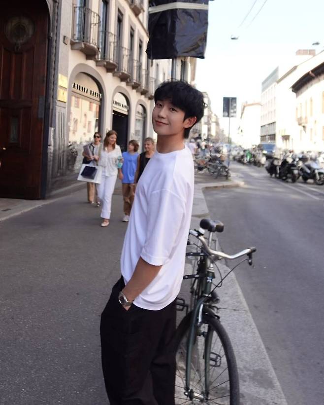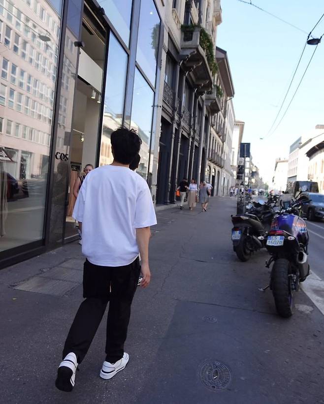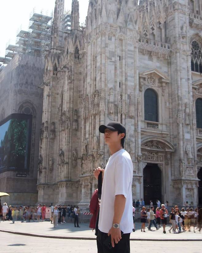 정해인의 착장은 단순하지만 강렬했다. 루즈한 핏의 화이트 티셔츠와 블랙 팬츠라는 미니멀한 조합에, 블랙 볼캡과 실버 시계로 디테일을 더했다. 전체적으로는 꾸밈없는 듯 시크한 인상을 주며, 이탈리아 고딕 건축물 앞에서도 과하지 않게 스며들었다. 화이트 톤이 햇살을 받아 더욱 맑아 보이는 피부 톤과 조화를 이루며, 청량한 남친룩의 정석을 보여줬다.