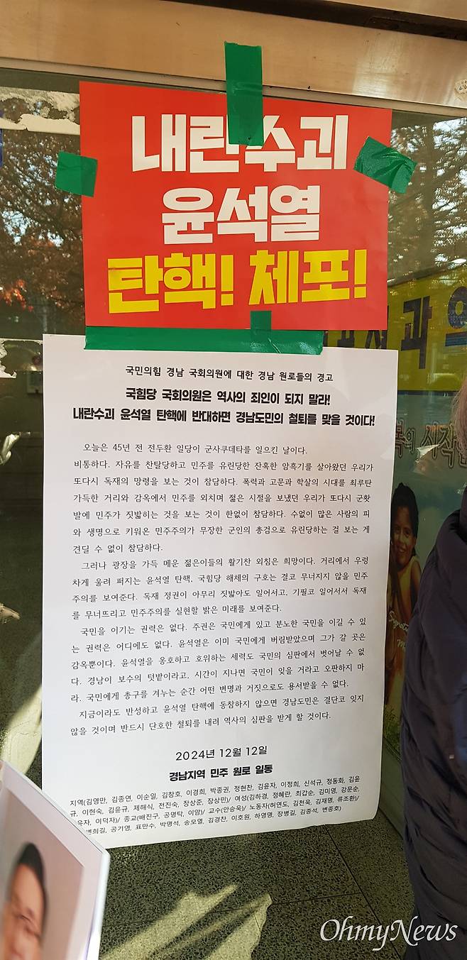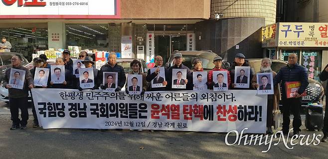 원로인사들은 "12월 12일 오늘은 전두환의 군홧발이 민주주의를 짓밟은 날이다. 우리는 박정희의 총칼 앞에서 민주주의를 위해 싸워 왔다. 전두환의 군홧발 아래에서도 싸움을 멈추지 않았다. 3·15의거와 부마항쟁, 그리고 6월항쟁의 거리에서 평생을 싸웠다"라며 "이번에 국민의힘 경남 국회의원들에게 윤석열 탄핵 찬성을 요구한다"라고 했다.