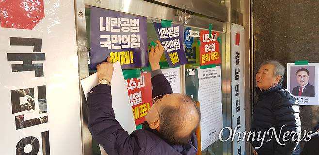 | ▲ 경남 지역 민주원로인사들이 12일 국민의힘 경남도당 앞에서 기자회견을 마친 뒤 경남도당에 '윤석열 탄핵에 동참하라'는 내용이 담긴 문서를 부착하고 있다. |