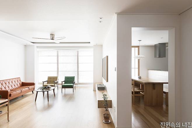손님들과 소규모로 다이닝 파티를 열기 위해 안방을 활용하는 아이디어를 냈다. 11자형으로 주방 조리 공간을 구성하고, 그 너머에 다이닝 테이블을 배치해 평범했던 안방을 아늑한 홈 파티 룸으로 완벽하게 변신시켰다.