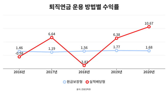 2020년, 퇴직연금을 적극적으로 운용한 직장인은 무려 10.67%의 수익율을 달성했습니다. 반면, 퇴직연금을 예적금 위주의 상품에 넣어둔 직장인은 1.68%의 매우 저조한 수익을 냈습니다. 어떤 분들은 이렇게 생각하실지도 모르겠습니다.