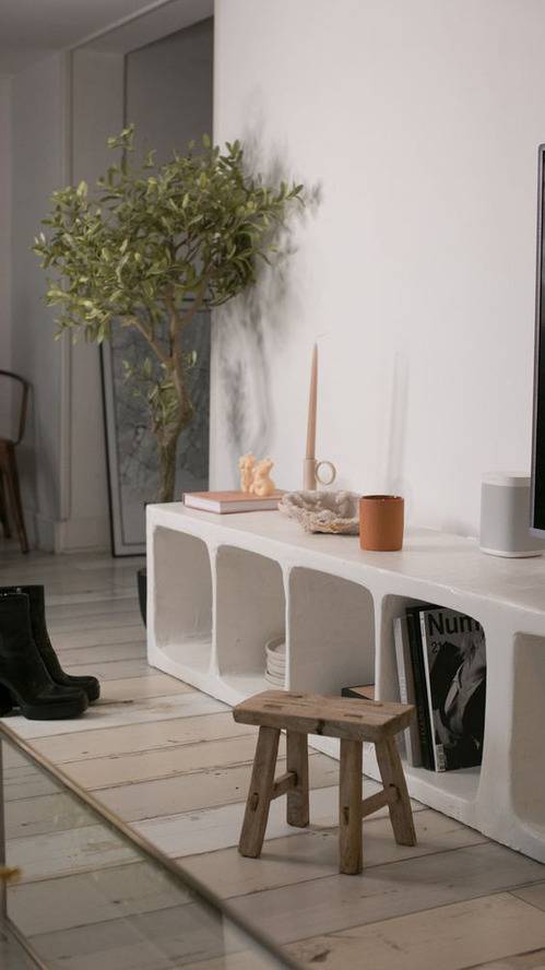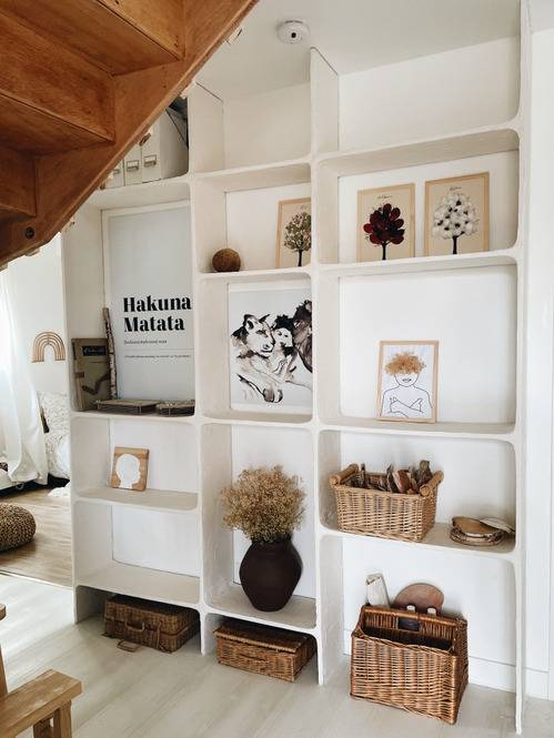 기성 제품 외에도 백시멘트와 몰탈, 석고 가루 등을 활용하면 선반을 직접 제작할 수 있다. 프레임을 짜고 헤라로 발라 질감을 살린 뒤, 라운드 마감과 바니시 코팅까지 하면 충분히 인테리어용으로 완성도가 높은 장식장을 만들 수 있다.
