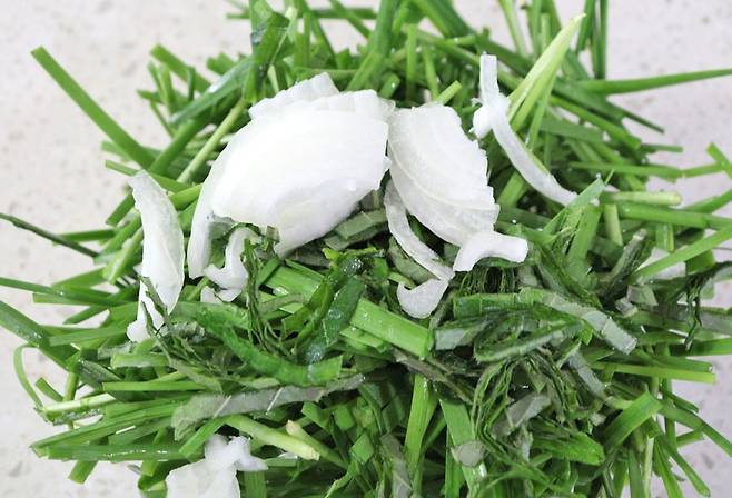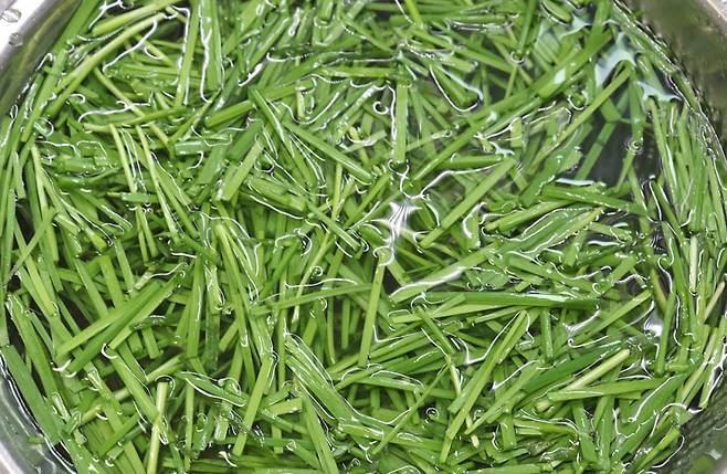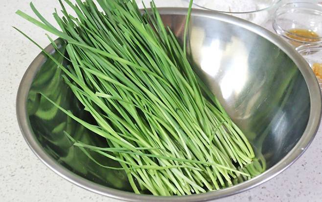 1. 부추는 깨끗이 씻어 4cm 정도로 자릅니다.