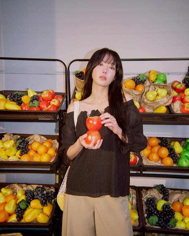 임수향은 블랙 오프숄더 블라우스와 베이지 와이드 팬츠를 매치해 내추럴한 무드를 강조했다. 과일 매장에서 빨간 사과를 들고 있는 모습은 소품과 의상이 조화를 이루며 여유로운 분위기를 완성했다. 특히, 블라우스의 어깨 디테일이 여성스러운 매력을 더한다.