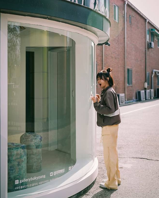 그리고 머리 스타일도 포인트!자연스럽게 올려 묶은 똥머리가 얼굴을 더 작아 보이게 해주고, 전체 룩의 내추럴한 무드를 극대화해줘요.