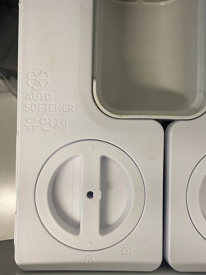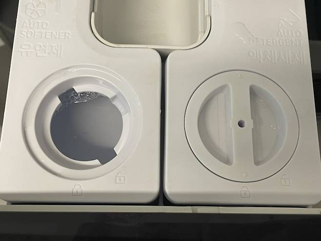 세제 투입구에는 세제를 미리 넣어두었고, 유연제 통에 구연산 녹인 물을 부으려고 해요.