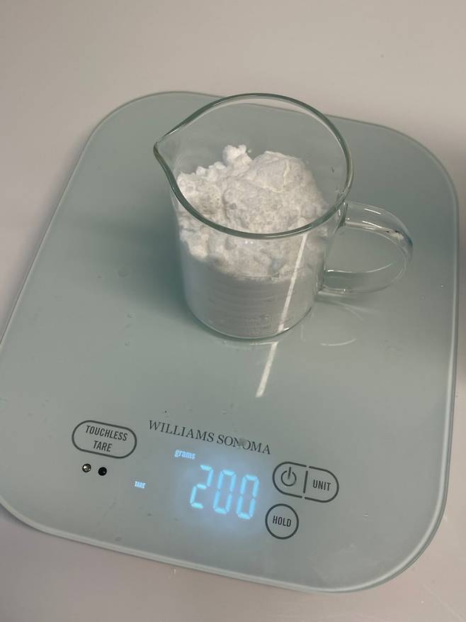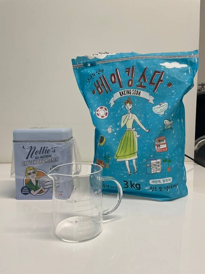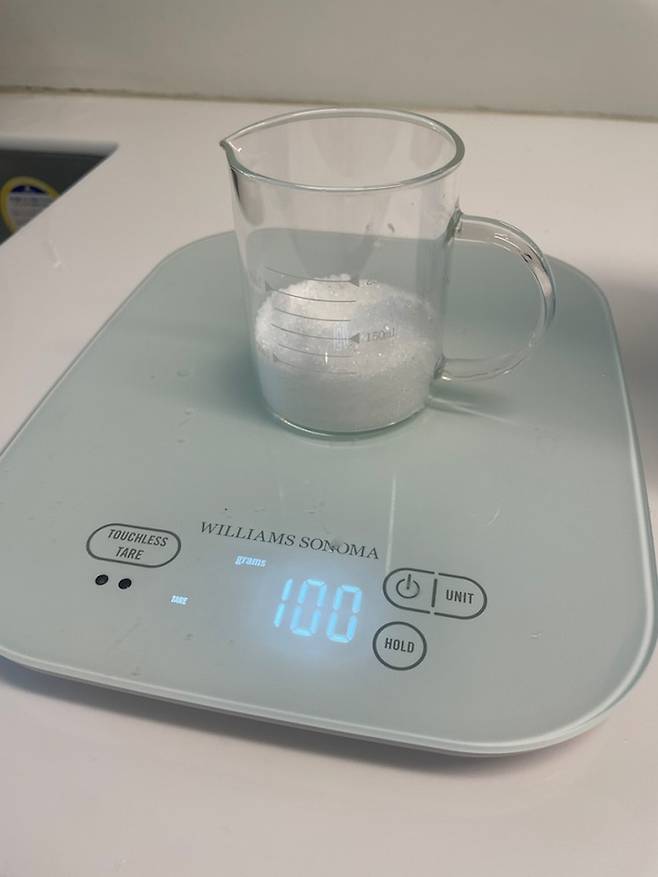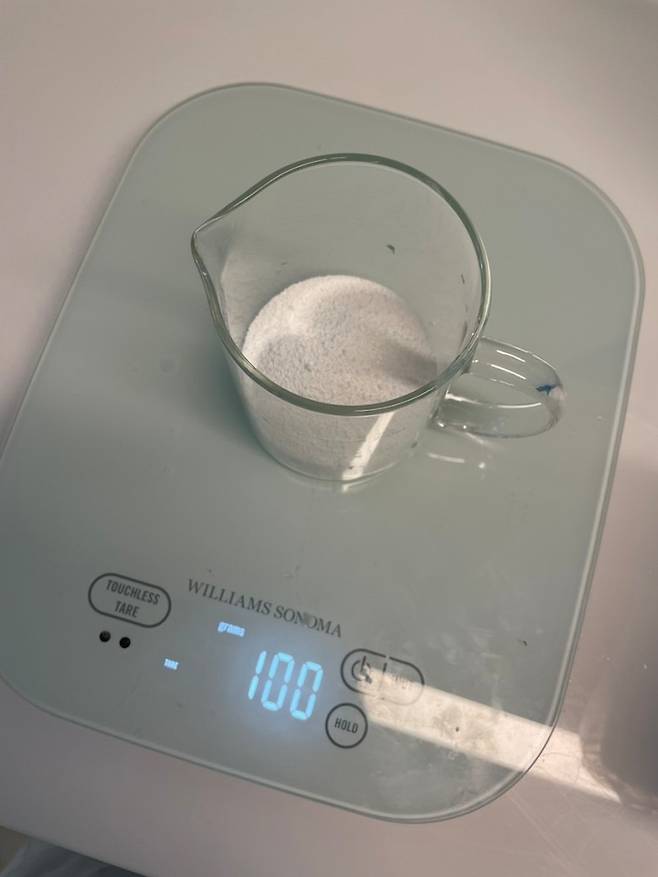 과탄산소다 100그램을 계량컵에 넣어줍니다.
