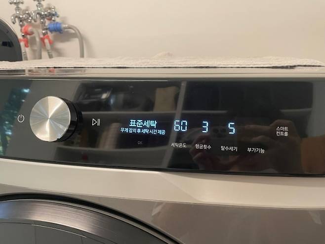 요즘 최신 세탁기에는 이불 코스 모드가 있는데 이불 코스에는 냉수가 나온다는 사장님 말씀에 표준세탁 모드로 두고 온도를 60도 설정, 헹굼 횟수 3회, 그리고 탈수 세기는 최강으로 설정한 다음 빨래 스타트를 눌러주면 된다고 하셨어요.