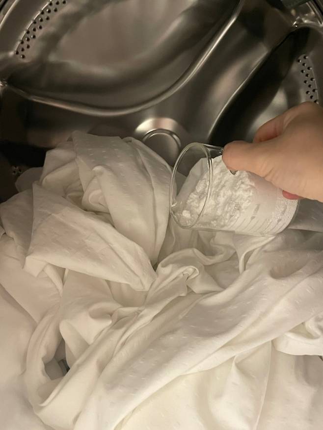 200g의 천연세제 2종(과탄산소다, 베이킹소다)을 이불 위에 부어줍니다.