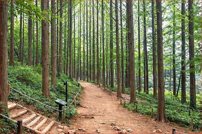 안산 자락길의 하이라이트는 단연 수직으로 곧게 뻗은 ‘메타세쿼이아 숲’입니다. 공룡 시대부터 지구상에 존재했다는 이 신비로운 나무들은 안산의 깊은 품 안에서 거대한 군락을 이루며 이국적인 풍경을 선사합니다.